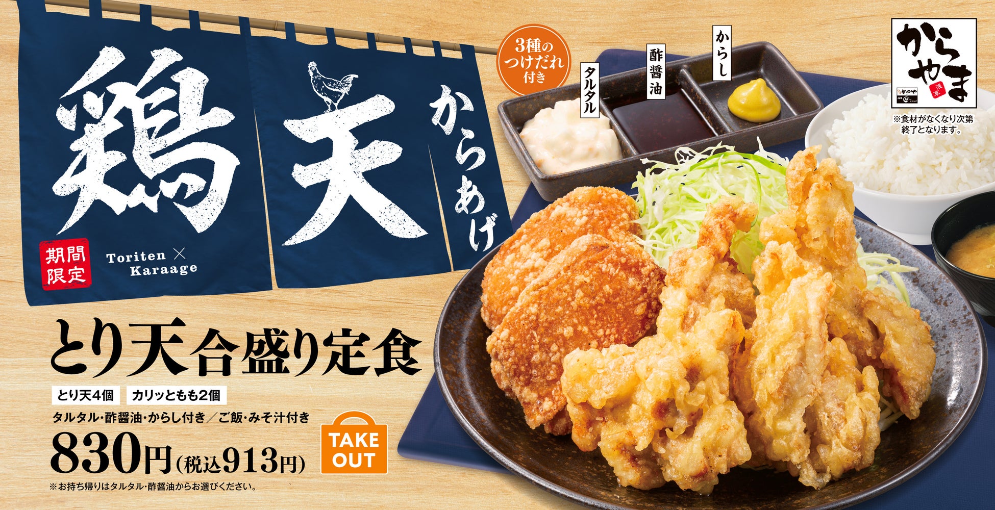 なお、「からやま」だけでなく、テイクアウトのからあげ専門店「からあげ縁」では「とり天」と「とり天合盛り弁当」をご用意しております。