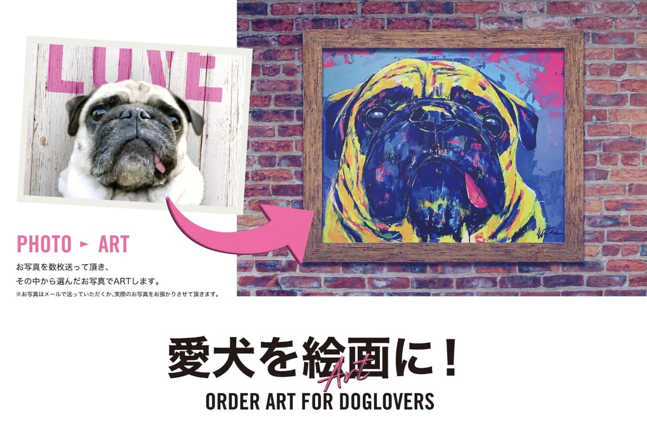 ニューヨークや全国の百貨店、ギャラリーで個展を開催し、日本各地のカフェやインテリアショップでウォールアートを手がけるなど、EIJI TAMURA DOG ARTの作品は街中で広く親しまれています。彼のアートは、動物と人間との間に存在する深い絆と相互理解のメッセージを込めており、伝統的な肖像画に革新的なツイストを加えています。